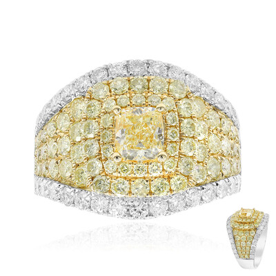 Capture la esencia de la elegancia con este elegante anillo de diamantes amarillos. Con un impresionante diamante central talla brillante antiguo de 0,705 quilates, rodeado de 70 diamantes amarillos redondos y 34 diamantes transparentes, esta pieza irradia lujo. Elaborado en oro amarillo y blanco 585, es ideal para noches glamurosas u ocasiones especiales. Compleméntelo con un vestido negro clásico para hacer brillar su estilo.