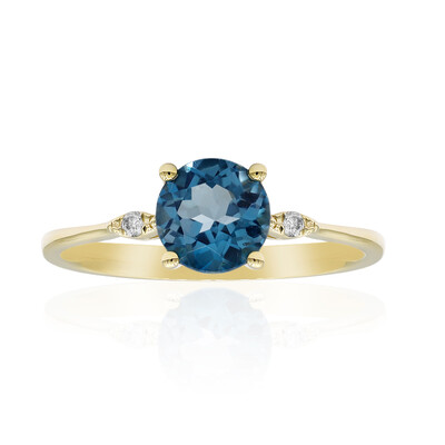 Descubra la elegancia con este anillo London Blue Topaz, elaborado en oro amarillo 416. El topacio brasileño, en una impresionante talla redonda de 1,04 quilates, está acentuado por dos diamantes talla brillante. Perfecto para añadir un toque de sofisticación a cualquier atuendo, este anillo brilla tanto en eventos formales como en reuniones informales. Combínelo con un elegante vestido de noche para un look realmente cautivador.
