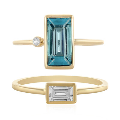 Descubra el encanto de estos anillos de oro Ratanakiri Zircon, donde la elegancia se une a la sencillez moderna. La gema principal, de 2,499 quilates y talla baguette, capta la atención con sus tonos azules claros. Circonitas más pequeñas de 0,523 ct y 0,032 ct añaden un refinado brillo. Elaborado en oro de 9 quilates con un peso combinado de aproximadamente 3,3 g, este conjunto ofrece un peso total de gemas de 3,054 quilates, lo que promete durabilidad y lujo. Perfecto para veladas sofisticadas o para añadir un toque de gracia a su atuendo diario.