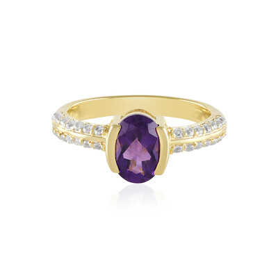 Descubra los ricos matices de una amatista siberiana engastada en un espléndido anillo de plata de ley chapada en oro. Esta pieza presenta una gema de talla ovalada de 1,169 quilates, flanqueada por el brillo de 28 circonitas de talla redonda que suman 0,333 quilates. La combinación de la amatista de color púrpura intenso y el luminoso baño de oro ofrece un toque regio a cualquier conjunto. Ideal para añadir un toque de elegancia a su atuendo de noche o para elevar su estilo cotidiano.