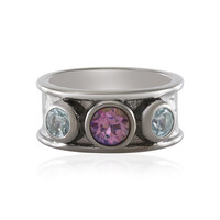 Descubra el encanto de este anillo de plata de ley, adornado con un cautivador cuarzo místico rosa de 0,396 ct, rodeado por dos topacios azul cielo de 0,569 ct. La refrescante mezcla del suave tono rosa y el sereno azul, ambos procedentes de los exuberantes paisajes de Brasil, hacen de este anillo un tesoro para cualquier colección. Engarzado en plata de ley 925, el encantador diseño refleja la luz con cada movimiento. Perfectamente preparado para llevarlo a diario o para añadir un toque de color a un atuendo especial, este anillo promete ser una adición encantadora a su repertorio de joyas.