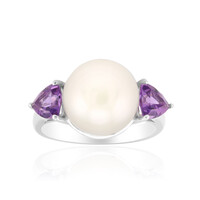 Descubra la elegancia con este elegante anillo de plata con perlas y amatistas. Con una lustrosa perla blanca de agua dulce china de 10 mm, flanqueada por dos cautivadoras amatistas brasileñas en talla trillón. El engaste de plata de ley 925 realza su moderno diseño, haciéndolo perfecto tanto para ocasiones formales como para salidas informales. Combínalo con un elegante vestido de noche o una blusa impecable para darle un toque de sofisticación.