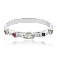 Este encantador anillo combina ingeniosamente los tonos fríos de la plata de ley 925 con un conjunto multicolor de piedras preciosas, aportando elegancia cotidiana a su dedo. La pieza central es un topacio blanco talla marquesa de la India, flanqueado por vívidos acentos de rubíes talla redonda de Tailandia, citrinos de Brasil y un zafiro azul de Madagascar. Con un peso total de 0,279 quilates, este anillo exhibe una armoniosa mezcla de tesoros mundiales en un diseño sutil pero llamativo, adecuado tanto para salidas informales como para eventos más formales. Su versatilidad lo convierte en un complemento exquisito para cualquier colección de joyas.