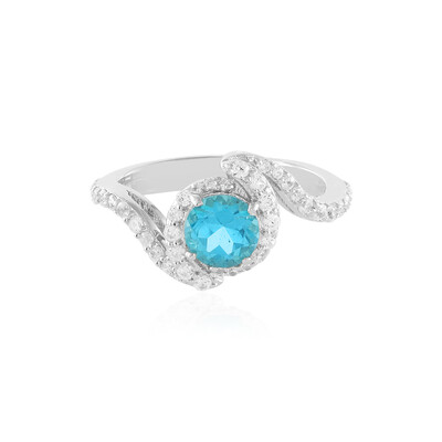 Este exquisito anillo presenta un radiante topacio paraiba brasileño de talla redonda de 0,88 quilates, engastado en medio de un brillante halo de circonitas tanzanas que suman un total de 0,607 quilates. Elaborado en plata de ley 925 pulida con un baño de platino para un brillo duradero, este anillo tiene un peso total en quilates de 1,495 quilates. El tono turquesa vibrante del topacio hace que sea una pieza central llamativo para cualquier conjunto. Ideal tanto para la elegancia diurna como para el glamour nocturno, este anillo promete ser una versátil incorporación a su colección de joyas.