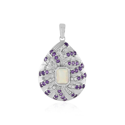 Este colgante de plata de ley, una obra de arte para su colección, celebra el encantador juego de colores con un ópalo Welo etíope en el centro, flanqueado por una constelación de brillantes amatistas brasileñas y radiantes circonitas de Camboya. El intrincado diseño, reminiscencia de la elegancia vintage, está chapado en platino para un brillo fascinante. Ideal para añadir un toque de sofisticación tanto a la ropa de día como de noche, es una pieza con calidad de reliquia que deslumbra en cualquier evento.