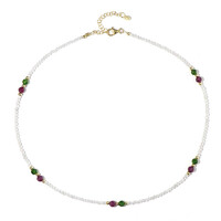 Sumérjase en la elegancia con este impresionante collar de cuentas de diópsido ruso, rubíes mozambiqueños y circonitas camboyanas. Estas gemas, facetadas para mayor brillo, se complementan a la perfección con plata de ley chapada en oro. Su versátil longitud de 45-50 cm lo hace ideal tanto para ocasiones informales como formales, añadiendo un toque de sofisticado encanto a cualquier atuendo.