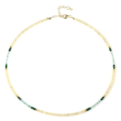 Descubra una radiante mezcla de ópalos de Etiopía, esmeraldas de Colombia y Zambia, y hematites dorada de Estados Unidos, todo ello engastado en plata de ley 925 chapada en oro. Con un total de 25,667 quilates, este exquisito collar presenta formas variadas y cuentas facetadas. Perfecto para realzar un atuendo de noche o complementar un conjunto chic de día, su delicado diseño añade un toque de elegancia a cualquier ocasión.