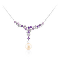 Descubra la elegancia con este impresionante collar de amatistas y perlas. Centrado por una lustrosa perla china de agua dulce, esta pieza está adornada con brillantes amatistas de Bolivia, Zambia y Brasil, complementadas por topacios blancos nigerianos. Realizado en plata de ley 925, añade un toque de sofisticación a cualquier conjunto de noche, perfecto para eventos formales o una cena romántica.
